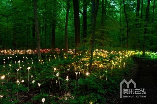 在湖面上Munro運用了閃光的CD漂浮在水面,仿佛在給睡蓮致意。在岸邊,7000森林的燈盞展現(xiàn)了它迷人的誘惑。
