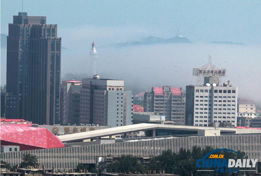 2012年8月2日,山東煙臺,濱海建筑在平流霧映襯下仿佛海市蜃樓。