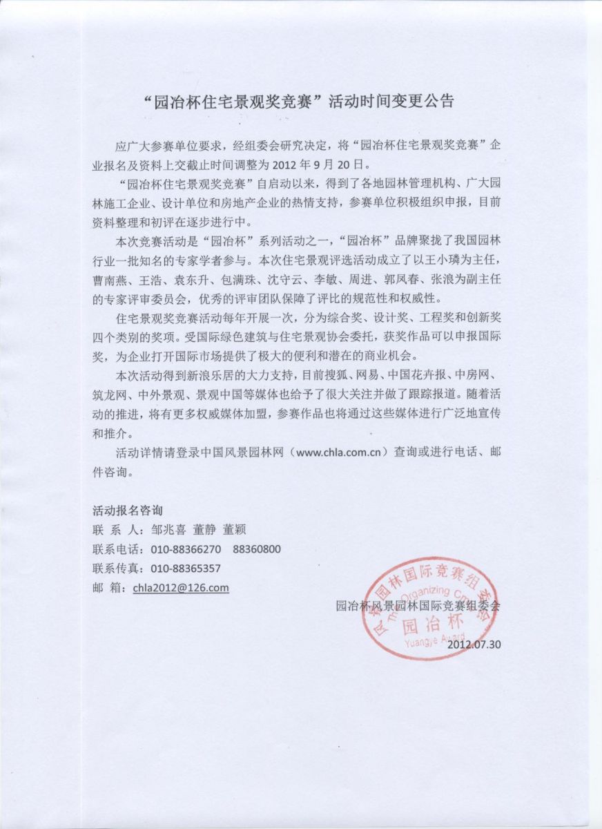 應廣大參賽單位要求,經組委會研究決定,將"園冶杯住宅景觀獎競賽"企業報名及資料上交截止時間調整為2012年9月20日。