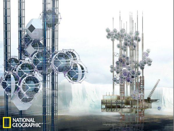 一個個球形模塊可以被用來蒸餾提純海水并儲備制成的淡水,隨后將其供應給貧水國家。根據給出這一設計的南非團隊的說法,這樣一座平臺還可以為長期在此進行研究工作的科學家提供維持生活的條件。