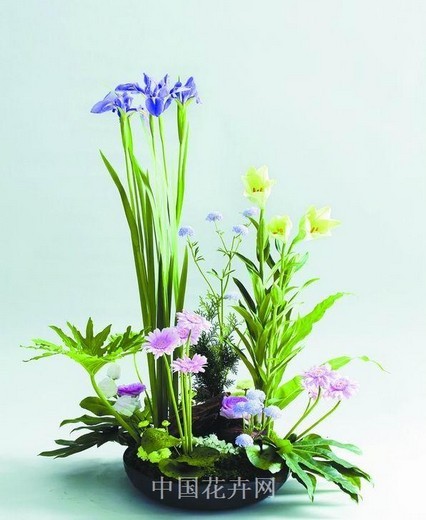 制作庭院花藝設計作品,就像是我們在設計一個縮小的花園。插花的技巧與自然景觀的設計技巧相同,但底部鋪陳的限制較少。