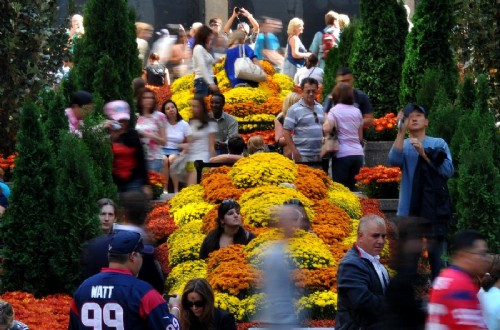 近日,在美國紐約洛克菲勒中心廣場,游客流連在菊花叢中。初秋時節,數萬株菊花被擺放在紐約曼哈頓地標建筑洛克菲勒中心廣場,吸引了大量游客和市民駐足觀賞。