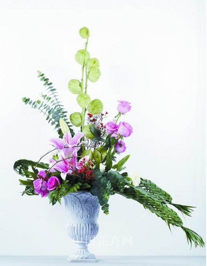 制作步驟:1、裝填花泥:取適量吸足水的花泥,填于羅馬盆中,花泥高于花器口約4厘米至5厘米,備用;