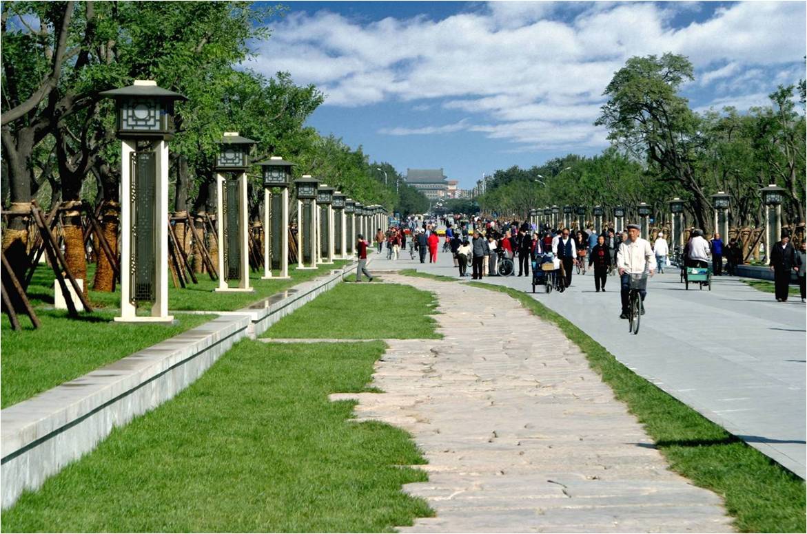 南中軸綠地北頂正陽門,南接永定門,面積近12萬平方米。在建設中挖出了原有的御道,只此就已經體現了十分厚重的歷史文化信息,所以除了一個日晷和嘉量的石雕以外,沒有做任何其他小品,只在燈柱、座椅上做了一些古典的紋樣。這是最恰當的表現文化的方式。