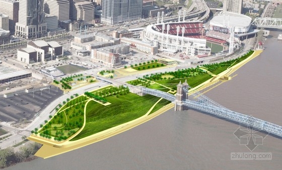 菲利斯•W•斯梅爾濱河公園位于辛辛那提市中心,它沿俄亥俄河建造,占地約0.13平方公里。作為沿河公園群中最大的一座,這座公園緊密地與周?chē)甏蟮某鞘械貥?biāo)聯(lián)系在一起,它與羅布林大橋、國(guó)家地下鐵路自由中心、保羅•布朗體育場(chǎng)、大美國(guó)棒球場(chǎng)相映生輝。通過(guò)河岸通道的建設(shè),濱河公園如項(xiàng)鏈般串聯(lián)起了河畔的公共空間,它將遍及全州的休閑小道和自行車(chē)系統(tǒng)拉攏過(guò)來(lái),并重新將辛辛那提市中心與俄亥俄河連接起來(lái)。佐佐木在公園上進(jìn)行的設(shè)計(jì)對(duì)附近的羅布林大橋——一座充滿(mǎn)歷史印跡的建筑符號(hào)——來(lái)說(shuō)簡(jiǎn)直就是絕佳伴侶,二者之間的區(qū)域布置著一系列大型聚會(huì)場(chǎng)地、靜態(tài)休憩場(chǎng)所和規(guī)劃項(xiàng)目供人使用。