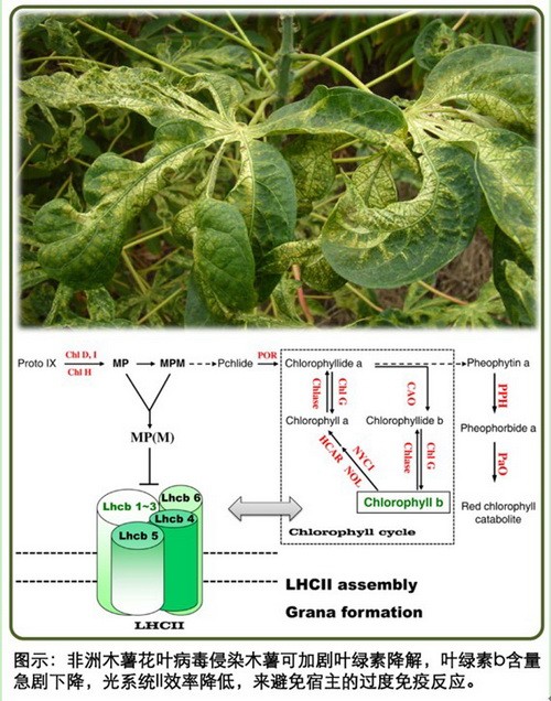 上海辰山植物園能源植物生物技術組研究人員利用高通量測序技術研究了受非洲木薯花葉病毒侵染木薯的全基因組水平轉錄響應,表明光合作用相關的通路所受影響最大,特別是葉綠素降解相關基因明顯上調,而編碼捕光復合體II的主要天線蛋白基因表達下調;結合受侵染葉片細胞中葉綠素a含量不受影響而葉綠素b含量急劇下降,并且基粒垛疊層數減少,表明植物細胞可通過調控葉綠素循環來維持葉綠素a的穩定,并且減少光系統II的效率,降低病毒侵染對宿主細胞產生的影響。該研究不僅闡明了雙生病毒感病導致木薯葉片褪綠病癥產生的原因,而且表明病毒對光系統的非致死影響是其避免宿主劇烈免疫反應的一種策略,是病原與宿主長期共進化的結果。