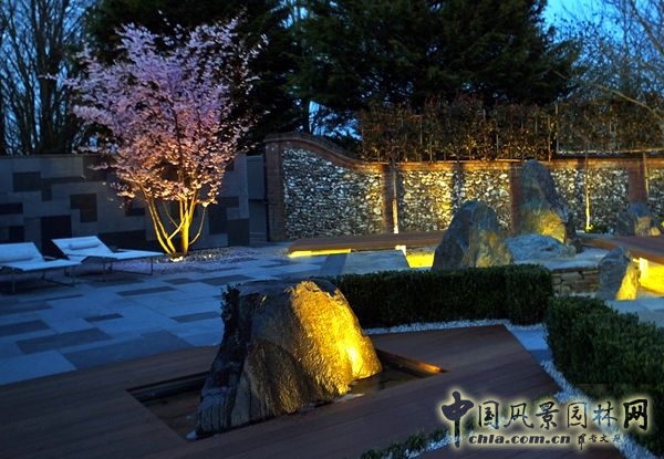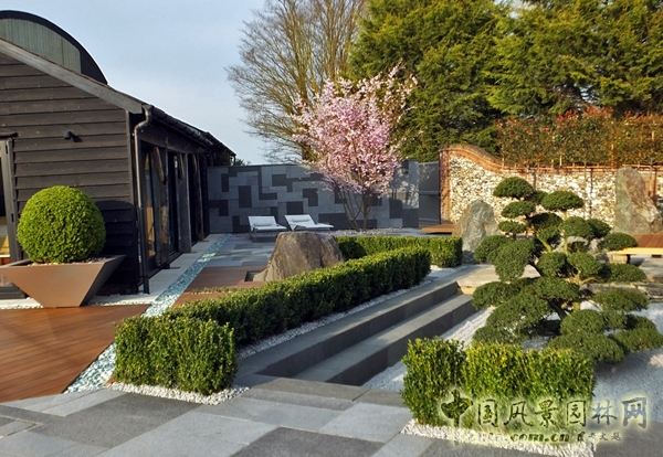 保留下來的一棵成年樹坐落在園子的角落里,有種滄桑感。大多數植物都是日本的物種如楓,山茶花,冬青,蕨類植物,櫻桃,平臺上的微型草,還有竹子。在寺廟的低處有兩個用做觀景平臺的浮硬木甲板,在這里,視線可以越過主屋的游泳池去瀏覽鄉村風景。甲板與再生約克石鋪成的小徑相連,約克石的色調、木材的色調與深色花崗巖交相輝映。