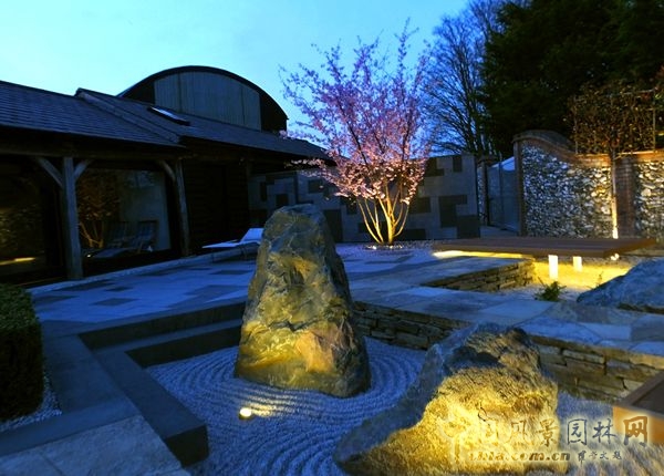 該園子從東到西被兩個建筑和一座圍墻所包圍,西側是開放的。太陽的方位對于日本林地植物的生長來說是很理想的。最初,地面鋪設沒有高差,可以直接進入建筑物,但沒有更多的考慮視覺效果。之后,降低大部分空間做了一個下沉花園營造出寺廟的感覺,也強調了庭院空間的邊緣。