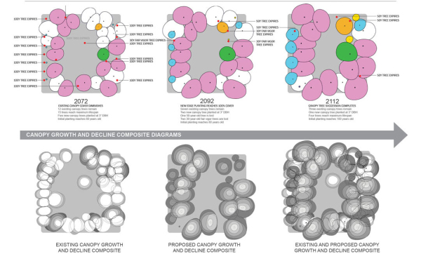 原來的道路并沒有改動,以最大限度的減少對于植物根部的破壞,僅僅是去掉了可移動的花盆,以增加景深?,F有的鋪路材料都要進行回收,并用于建造令人興奮的可以承接大型和即興的演出活動的功能靈活的新廣場。廣場的地勢提供了天然的演出平臺,位于北部的緩坡可以作為半圓形的露天劇場,或者作為人們享受日光浴和欣賞美景的場所??沙掷m性的景觀設計實踐,例如將雨水匯集到雨水花園中,在自然地域增加生物棲息地等,確保了設計有益于生態系統,同時也建造了一個讀書冥想空間和觀鳥勝地。