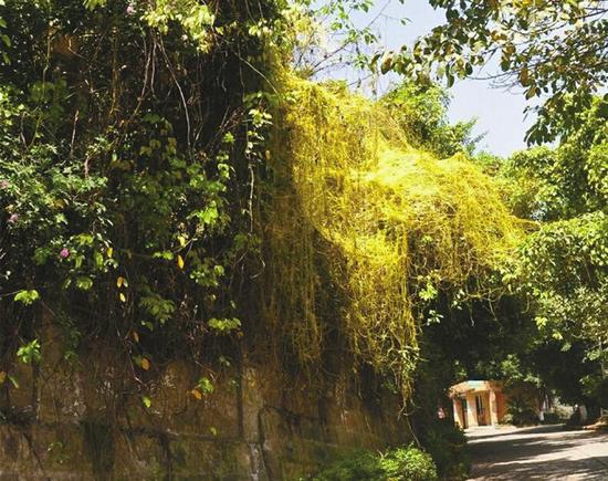近日,在順慶區(qū)舞鳳山下山通道的道路一側(cè),細(xì)心的市民會(huì)發(fā)現(xiàn),一些原本長(zhǎng)勢(shì)較好的樹木被一種黃色的植物纏繞、覆蓋,有的樹木已死亡。記者在現(xiàn)場(chǎng)看到,在靠近山體一側(cè)的樹木樹冠上掛滿了黃色的藤蔓,就像被噴上了黃色的彩條,其中較矮的灌木叢更是像被一張黃色的大網(wǎng)覆蓋。