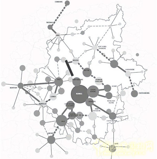 如圖所示是雷恩市與其他各個城市位置的布局,其中的一大特點就是它是一個群島狀的布局,中心城市是雷恩市,周邊有一些衛星城,散落在雷恩市的周邊。雷恩城市是整個大區的中心;周邊有一些小的衛星城,是各個小區的中心,中間布有一些城市的綠化帶。在城市發展的過程當中,由于整體結構比較松散,每個區域都需要一些基礎性的設施,比如游泳池等公共類型的建筑,所以我們需要把這些區域劃分出來,在每個地方形成一個城市組團,并在每個地方增加相應的基礎設施建設的投資。