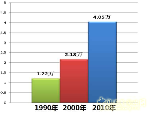 從增長的速率來看,絕大部分的土地依然是對原有耕地的占有。1990到2000年期間,約有53.4%的城市擴張面積來自耕地;2000至2010期間,這個數字達到68.7%。從絕對量上來看,第一個十年是770萬畝;第二個十年是1900萬畝,是第一個十年的2.46倍。盡管國家法規一再要求不能占用農業耕地,但實際上這仍然是一個非常顯著的問題。