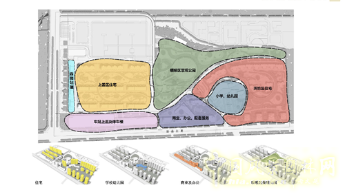 上一幅圖是土地利用規(guī)劃的圖,當(dāng)時(shí)已經(jīng)做好了,這里有居住區(qū)、大型地鐵樞紐站、小學(xué)、幼兒園、商業(yè)和辦公區(qū)域。一期工程大概可供5千戶居住,總工程大概可供1萬5千到1萬6千人居住。整個(gè)的設(shè)計(jì)最大的挑戰(zhàn)就是一期的住宅與平臺(tái)有七米的高差,二期的住宅與平臺(tái)之間是負(fù)九米的高差。于是,我們決定利用這個(gè)高差,設(shè)計(jì)一個(gè)如圖所示的空中走廊。
