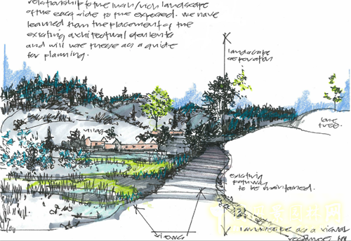 我們?cè)谧隽朔治鲆院螅弥治鰣D到現(xiàn)場(chǎng)再去察看。同時(shí)我們也集結(jié)了全球5個(gè)特別有名的不同專(zhuān)項(xiàng)的專(zhuān)家共同參與進(jìn)來(lái)。所有的設(shè)計(jì)不可能都在辦公室完成,因此必須到基地去,必須了解基地,了解人文,了解周邊才能給做好設(shè)計(jì),絕對(duì)不可以只在自己的辦公室里做項(xiàng)目。人到了這個(gè)地方,他的感受,他對(duì)這個(gè)項(xiàng)目基地的體驗(yàn)是完全不同的,也是任何東西都無(wú)法替代的。我們用了很慣常的一個(gè)方法——手繪來(lái)畫(huà)出我們當(dāng)時(shí)的體驗(yàn)。我還想重申一下,對(duì)于設(shè)計(jì)師來(lái)說(shuō)即使在電腦時(shí)代也絕對(duì)不要放棄手繪,因?yàn)樵O(shè)計(jì)師的手、腦子和心是完全聯(lián)系起來(lái)的,所以在設(shè)計(jì)過(guò)程中,手是很重要的一部分。