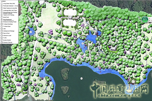 這是湖面建成以后的樣子。我們剛開始第一批苗圃的原木種植65000棵,大多數都被用在建花園和大湖周邊的綠化。