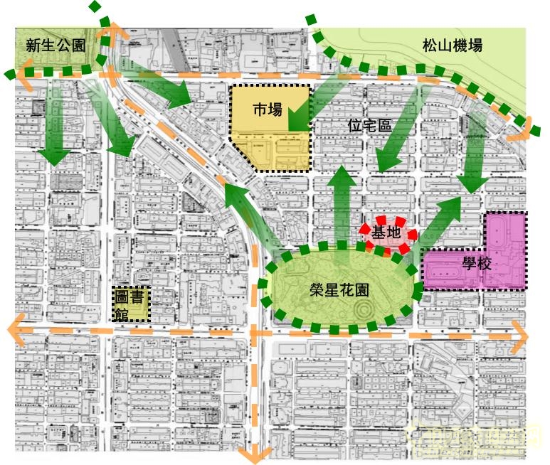 最后一個(gè)項(xiàng)目是臺(tái)北市的榮星花園,順便介紹一下我們公司的位置,就在榮星花園的對(duì)面。這是一個(gè)比較大的公園,這里有一個(gè)松山機(jī)場(chǎng),按照規(guī)劃會(huì)在未來(lái)的10-20年之間被遷走,因?yàn)槭兄行氖遣粦?yīng)該建有機(jī)場(chǎng)的,但是現(xiàn)在桃園機(jī)場(chǎng)還滿足不了旅客的需求,所以這里被暫時(shí)保留。未來(lái)機(jī)場(chǎng)遷走,這片場(chǎng)地就將成為臺(tái)北市的中央公園。另一邊還有一個(gè)新生公園,就是當(dāng)年臺(tái)北市舉辦花博的場(chǎng)地,也是一個(gè)大型公園。這個(gè)區(qū)域里面所有的房子,因?yàn)樗缮綑C(jī)場(chǎng)的緣故,都限高,最高只有5層。未來(lái)如果松山機(jī)場(chǎng)遷走,這些房子一定會(huì)進(jìn)行改建。我剛好在沒(méi)有改建之前接到這個(gè)項(xiàng)目,就補(bǔ)充了一個(gè)概念,計(jì)劃讓這三個(gè)綠帶在改建之后可以串聯(lián)在一起。我們的想法是將一樓能夠挑空的部分盡量挑空,將所有空間都變成戶外活動(dòng)空間,如果每一個(gè)單元是都是這樣,就可以一路穿過(guò)去,直到松山機(jī)場(chǎng),甚至新生公園。我提出這個(gè)概念,經(jīng)過(guò)模擬,當(dāng)挑高15公尺的時(shí)候,所有的建筑物下都是懸挑結(jié)構(gòu),建筑物蓋在上方,這樣臺(tái)北市可能會(huì)擁有一個(gè)更大的公園,那時(shí)候的公園就不是中央公園、新生公園,或是榮星花園,而是三個(gè)加在一起的一個(gè)超大公園。當(dāng)你走在這里面的時(shí)候,可以感受不一樣的空間。臺(tái)灣白天的時(shí)候光照比較強(qiáng),這些建筑物下的空間,成為了一個(gè)可以遮蔭的地方。到晚上,可以請(qǐng)燈光設(shè)計(jì)師在天花板做一個(gè)燈光效果,這里就變成了另外一個(gè)空間,可以在其中體驗(yàn)別樣的場(chǎng)景。將建筑抬高之后,空氣也會(huì)隨之流動(dòng),因此整個(gè)臺(tái)北市的空氣也會(huì)變得更好,之前我也講過(guò),北京的霧霾也可以通過(guò)工廠重新進(jìn)行規(guī)劃設(shè)計(jì)而得到改善,到了晚上我們還可以利用燈光在下方的天花板上產(chǎn)生出另外一個(gè)空間。