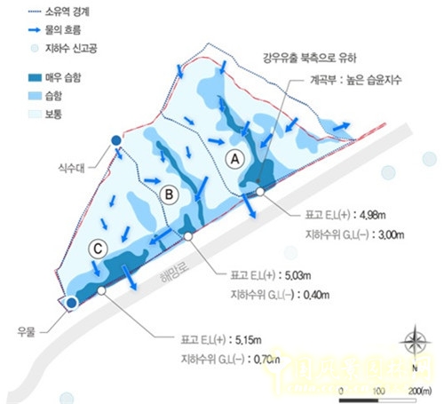 我們對當地的排水系統進行了一次調查,如圖,箭頭是排水的方向,水流很容易積聚在深藍色的區域,這些區域極易發生洪災。
