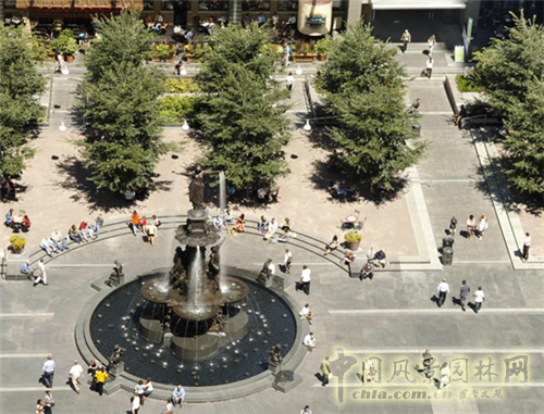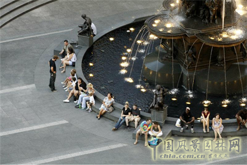為了改變原先噴泉廣場留給人們的不良印象,經(jīng)過重新設計的廣場主要在于營造出空間感,目的在于吸引人們來這里放松身心。為了完成這一目的,最重要的就是要移動噴泉的位置。原先噴泉的位置一年中有半年時間會被其他建筑物的影子所遮擋,以至于人們可能看不到噴泉。而經(jīng)過重新設計的噴泉廣場則煥然一新,人們可以在此進行娛樂活動或是坐著聊天。