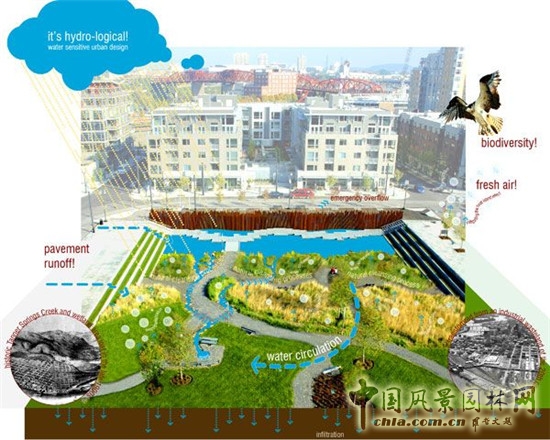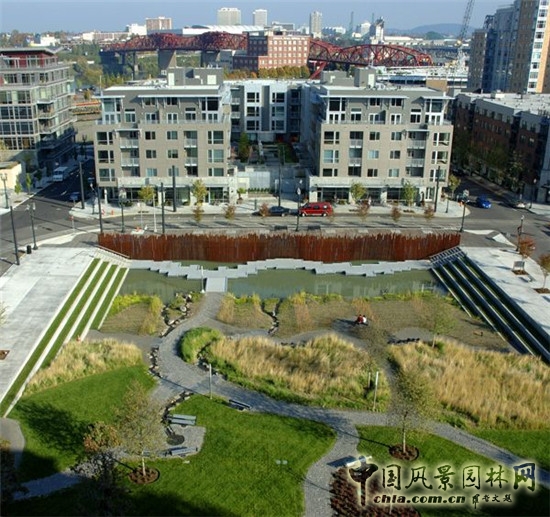 波特蘭珍珠區(qū)基址原為一片清泉滋潤的濕地,被坦納河(Tanner Creek)從中劃分開來,與寬廣的威拉麥狄河(Willamette River)相鄰。如今,這里已經(jīng)成為了商業(yè)和居住區(qū)域。在這片大約60m×60m的繁華地帶,設(shè)計師們重新塑造了一個嶄新的城市公園。公園的規(guī)劃結(jié)合了雨水收集創(chuàng)造的景觀和濕地本身的天然水景;一部分道路用木板鋪成,成為進(jìn)入濕地和草坪的活動通道;從鐵路軌道回收的舊材料被重新利用,建造成波浪形的"藝術(shù)墻,給游客強(qiáng)烈的沖擊感,喚起人們對歷史鐵路的記憶。