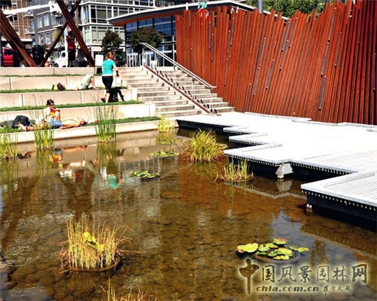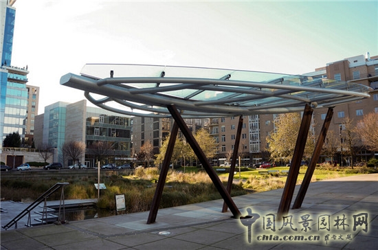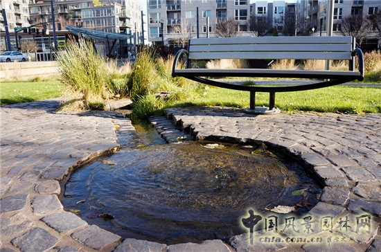 公園設(shè)計(jì)充分利用了基地地形從南到北逐漸降低的特點(diǎn),收集來自周邊街道和鋪地的雨水。收集雨水的亭子位于街道上成為唐納德溪水公園創(chuàng)新性最大的亮點(diǎn)。亭子被建成葉子的形狀,收集到的雨水在這里經(jīng)過處理后,重新以溪水和噴泉的形式進(jìn)入公園。
