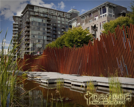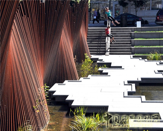 項(xiàng)目的另一個(gè)目標(biāo)是將當(dāng)?shù)厮囆g(shù)家的作品融入場(chǎng)地,并且不影響項(xiàng)目的自然之美。由于公園是一個(gè)下沉式公園,所以它的東面成為一個(gè)最佳地點(diǎn),設(shè)計(jì)師在這個(gè)地方做出了一個(gè)大膽的藝術(shù)設(shè)計(jì)。將回收來的鐵路軌道,制作成不同長(zhǎng)度的材料,以不同的傾斜角度創(chuàng)造出一個(gè)波浪的效果。為公園的游客提供一個(gè)背景,同時(shí)也分隔了街道和公園,圍合成一個(gè)平靜的綠色活動(dòng)空間。