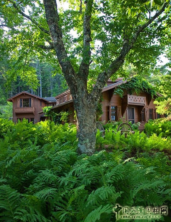 陽光透過成年的水樺樹照射在成片的繁茂的蕨類植物上,樹影斑駁。獨立而建的小木屋與周圍的景色相映成趣。