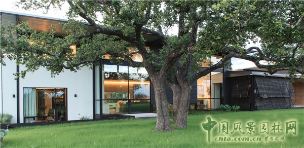 西南方向的住宅主建筑,其設(shè)計(jì)充分呼應(yīng)了壯觀的天然槲樹景觀。