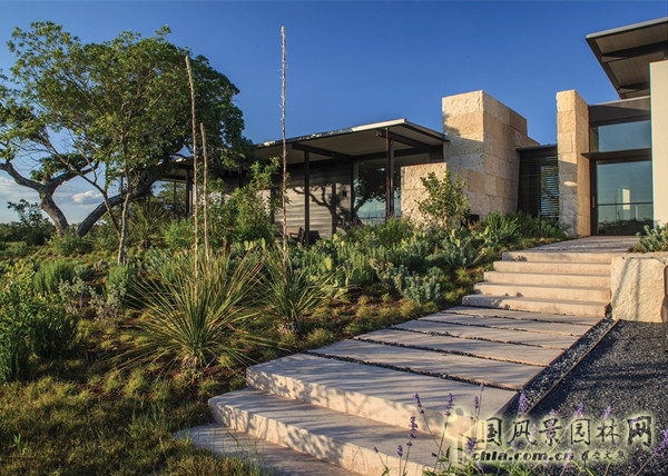 西側的花園中混種有多種本土植物,如百合、仙人掌和得克薩斯宿根花卉。