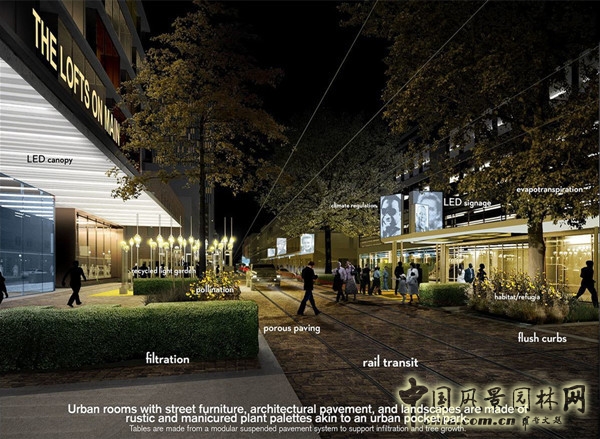 在具備街道設施、建筑路面和景觀的都市空間中,植被經過修整,造型各異,使得整個空間如同街心花園一般。景觀臺的設置也有利于雨水滲透和植物的生長。