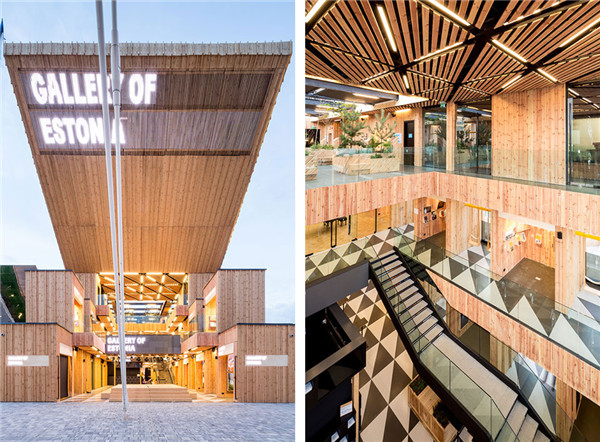 三層高的場館采用了相錯堆疊的箱體構筑而成,頂部的懸挑斜面底部向游客醒目的展示出場館之名“愛沙尼亞展館”。
