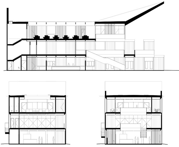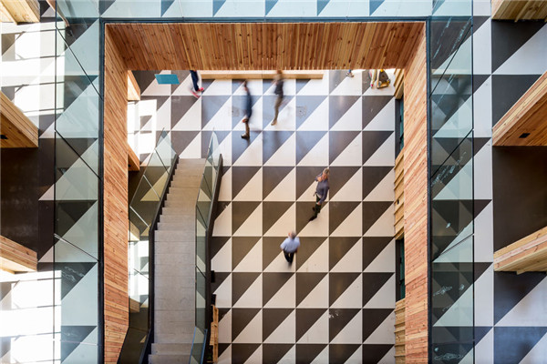 建筑從內(nèi)到外都采用了木條作為墻面和天花的創(chuàng)飾面,地面采用了三角花紋的石材鋪裝。室內(nèi)庭院木材條狀天花的走向與地面石材三角形斜面的角度一致。頂部花園的種植箱也采用了木材。此外,場(chǎng)館照明亮度可根據(jù)外界光照強(qiáng)弱自動(dòng)調(diào)節(jié)。