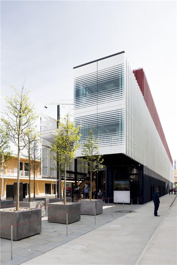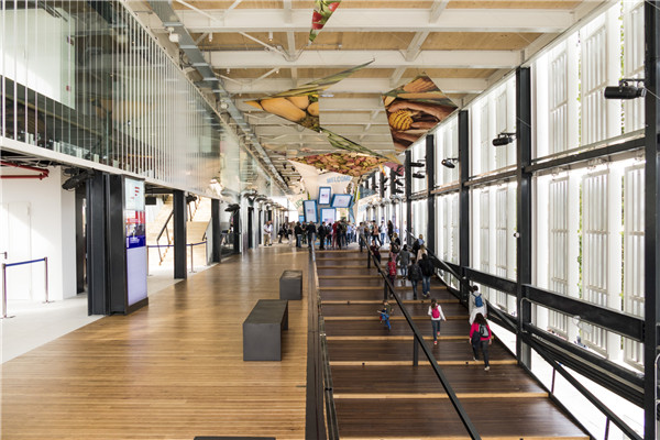 該館的場地細而窄,是典型的都市景觀設計風格,該館與一面模擬墻相連,內(nèi)設有電梯、手動扶梯、樓梯和機械軸類等;展館的屋頂是純數(shù)字化設計,該屋頂四周被SPD智能調(diào)光玻璃包圍,這種玻璃會根據(jù)當?shù)貙嶋H環(huán)境狀況將玻璃調(diào)暗或調(diào)亮;展館中有一個垂直的綠色農(nóng)場,植物皆被栽種在一個容器內(nèi),采用天線陣排列。漫步道在展館中央穿過,路面相對于展館地面凸出,材料選用的是可回收的Coney Island木板。