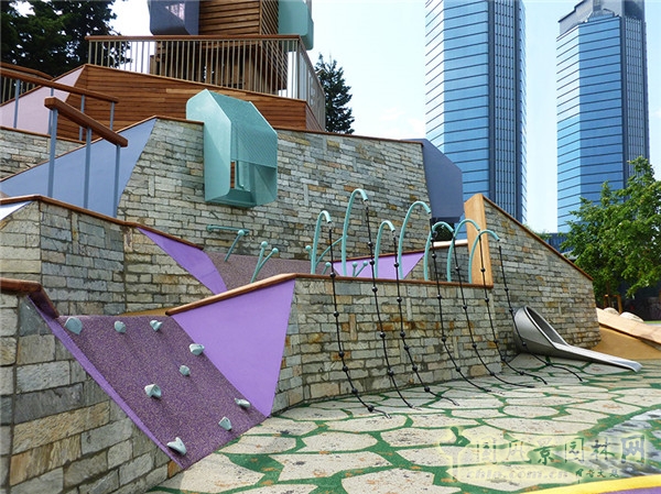 在深谷的周?chē)幸蛔?ldquo;山脈”作為其布景。屹立于此的數(shù)面墻壁展現(xiàn)出了無(wú)限的游樂(lè)潛力,孩子們可以在此攀爬、賽跑、捉迷藏、滑滑梯等,也可由此俯瞰游樂(lè)場(chǎng)的其他區(qū)域。從整體來(lái)看,所有的墻壁又共同構(gòu)成了一塊巨大的布景,游客從不同的觀景角度可欣賞到迥異的形狀。這里簡(jiǎn)直就是探險(xiǎn)的圣地:錯(cuò)綜的隧道迷宮、大型的滑梯、“鳥(niǎo)巢”、瞭望臺(tái)、窄巷等等,不一而足。一旦進(jìn)入山脈中,孩子們就可探索發(fā)現(xiàn)不同的通往山頂?shù)牡缆贰;菀郎焦榷ǎB接起了游樂(lè)場(chǎng)中的兩個(gè)區(qū)域。