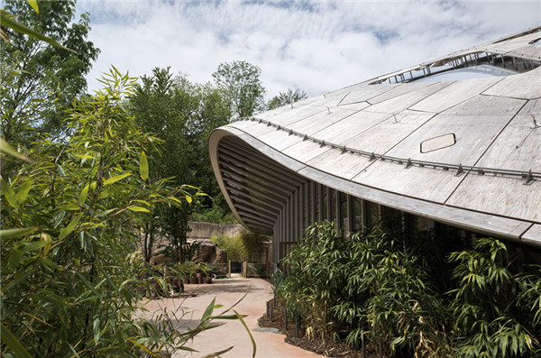 這座大象館有一個驚人的木屋頂,其形式自由,與周邊森林建立了有機的聯系,同時屋頂還能模擬再現森林中復雜的光環境:當陽光穿過屋頂斑駁的天窗,就像穿過叢林層層的樹枝。