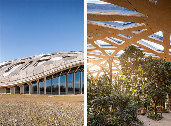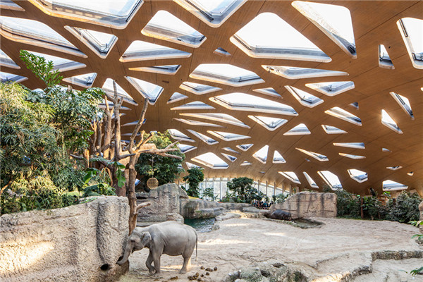 大象館屋頂自由輕巧的木外殼采用了預(yù)制三層板,然后在現(xiàn)場(chǎng)進(jìn)行彎曲和造型處理。整個(gè)形體更具結(jié)構(gòu)需求不斷變化著,最終成就一個(gè)動(dòng)感,自然,與景觀共生的建筑。