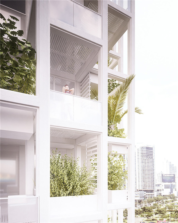 Penda首先將一棟建筑中的必要元素——結構、墻體、外立面、天花、地面、基礎設施、陽臺和景觀等要素從傳統的整體思維中分解出來。然后從一個模塊化的格構系統獲得靈感,在新的格構系統中只有網格結構和基礎設施是固定的部分。而其他的要素都可以通過工廠預制進行模塊化加工。這些模塊可以為客戶提供一份目錄,業主可從產品目錄中選取這些模塊。模塊范圍包括不同的地面單元、外立面單元、欄桿陽臺以及供植物生長的豐富多樣的花盆等。客戶可以任意選擇符合他們自己品位的元素進行搭配。Penda希望為業主提供的是一個工具,使他們成為自己公寓的設計者。