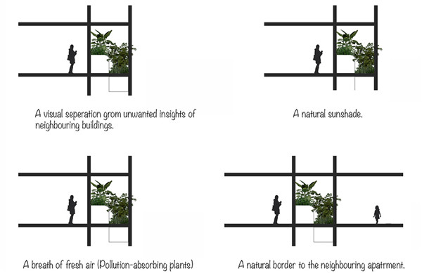 自然綠植將依附在外立面的格構進行生長,經(jīng)過一段時日之后,自然綠植將成為主要的面貌覆蓋于建筑表面。所以設計師也不用擔心過于凌亂的客戶選擇了,自然綠植會有機的把它們整合起來。建筑立面充當了一個室內與室外的中間介質,凈化空氣的自然綠植為室內氣候提供了更好的保護與調節(jié)。灰水回收系統(tǒng)收集屋頂?shù)挠晁蜕钣盟⑦M行二次利用來澆灌陽臺的綠植。基于印度的炎熱氣候特征,開放的公共空間為建筑創(chuàng)造了空氣自然對流,從而降低空調的使用。