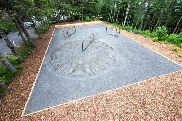 在位于加拿大魁北克省的國際花園節上,來自特拉維夫的talmon biran建筑工作室創作了作品“轉盤”,該裝置位于“干旱的陸地”上,靈感來自于日本的禪宗花園。在一片巨大的灰色沙礫池里,三個大轉盤放置在那里,它們的外形參考了農用機械的設計,底部的橫桿上有許多小的尖頭,當轉盤轉動的時候可以在沙地上劃出一個個圓形。該裝置由人手工驅動,整個花園的布局隨著幾個轉盤的轉動而不斷改變著,相比于以往只能在外面觀看,這次游客們可以到禪宗花園里面去親身體驗,為游客們提供了不一樣的體驗。