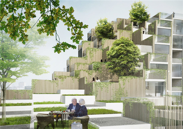 公寓和公園之間沒有明確的邊界,公寓就置身于公園之中。整座公寓大樓呈三角形,屋頂高低起伏,覆蓋有綠色植被。中心庭院不僅為各個房間提供了綠色美景,也提供了必要的通風(fēng)和光照。