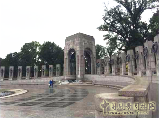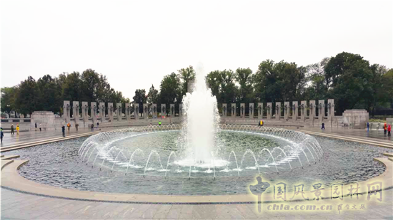 二戰(zhàn)紀(jì)念館坐落于林肯紀(jì)念堂和華盛頓紀(jì)念碑之間,為紀(jì)念在二戰(zhàn)期間服役的1600萬美國軍人而建。紀(jì)念館呈現(xiàn)為一個(gè)下沉的橢圓形廣場,中央有一個(gè)圓形的人工湖,周圍共立有56根花崗巖柱子,分別代表二戰(zhàn)期間美國的州及海外領(lǐng)土。