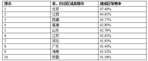 2014年全國各省、直轄市、自治區建成區綠化覆蓋率前十名排行榜