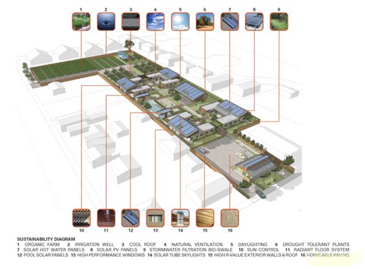項(xiàng)目可持續(xù)性圖解:1.有機(jī)農(nóng)場 2.灌溉井 3.冷屋頂 4.自然通風(fēng) 5.日光設(shè)施 6.耐旱植物 7.太陽能熱水板 8.太陽能PV板 9.生物洼地 10.陽光控制層 11.地板輻射系統(tǒng) 12.太陽能電池板 13. 高性能窗戶 14.太陽能管天窗 15.R-value性能高的外部墻體和屋頂 16.滲透鋪磚