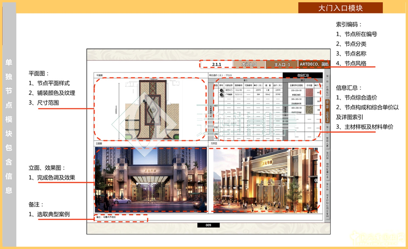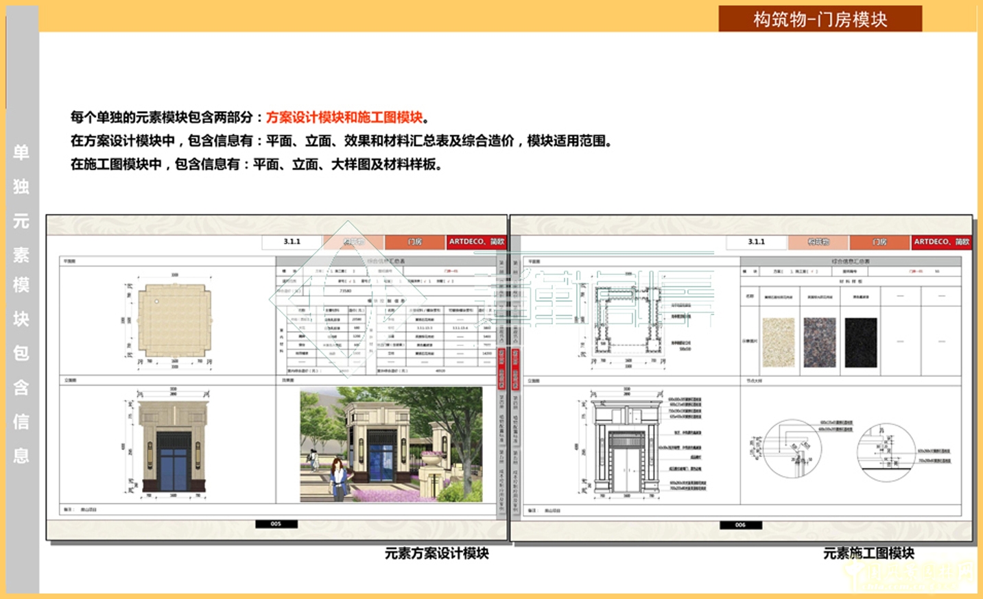 元素模塊內容的選擇,除了選取集團簽批的定額設計標準和標準部品外,還對外部優秀設計進行選擇,補充和完善元素模塊圖庫,方便設計選擇和成本控制。