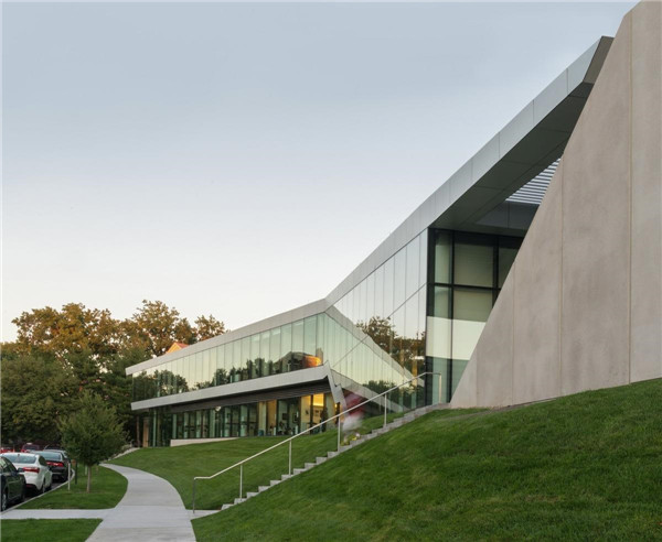 建筑采用折面的綠植屋頂,從場地中緩緩升起,下方采用玻璃墻以向室外的景觀開放。三翼相交的地方是一個雙高的集會空間,把建筑的兩層統一起來。兩層高的雙層玻璃墻圍合了這個空間,向西邊的運動場和遠處的美術館開放視野,同時緩解過度的熱負荷。