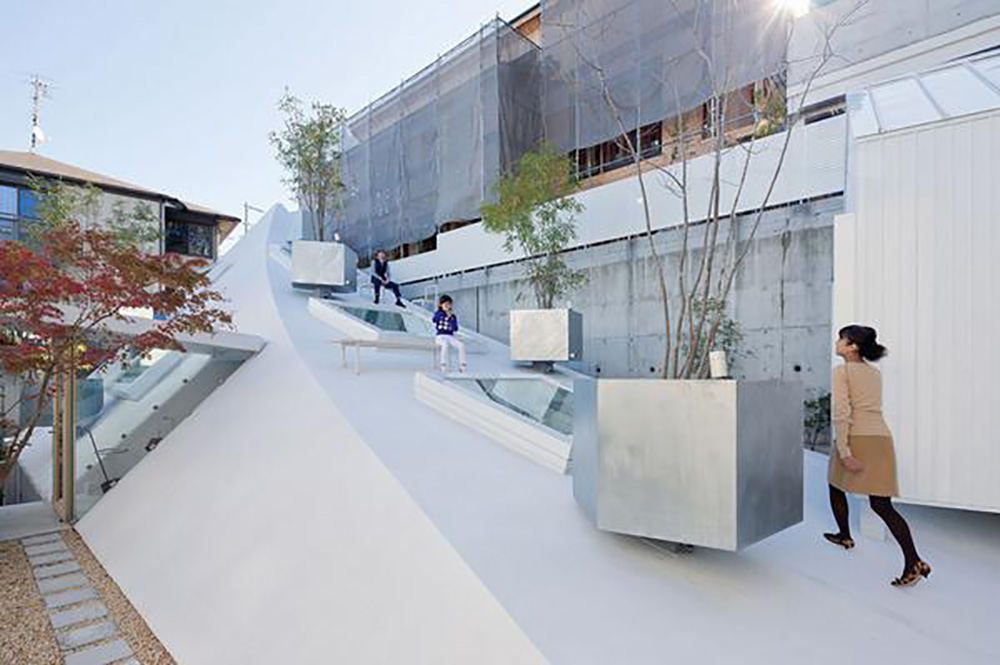 藤本壯介(sou fujimoto)設(shè)計(jì)的這座House K是一個(gè)狹長(zhǎng)住宅,位于日本大阪東北部密集的城市結(jié)構(gòu)中。場(chǎng)地呈不規(guī)則的L形,三面被相鄰的房子壓迫,一面與一幾叢小樹(shù)接壤。因此出去建造房子的空間很難再有室外活動(dòng)空間。于是他將住宅從一側(cè)慢慢從地面升起,直到最東側(cè)結(jié)束,形成一個(gè)大斜坡,同時(shí)作為建筑的屋頂,于是這個(gè)大斜坡便解決了急需的室外活動(dòng)空間——一個(gè)豐富而有趣的大露臺(tái)。