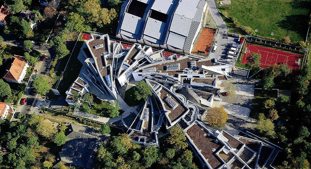 澤維·霍克一直在為實(shí)現(xiàn)這座螺旋型建筑物的想法而工作著。猶太小學(xué)的的扇形建筑放在周圍,活動(dòng)空間都聚集在內(nèi)側(cè),邊上有一條小跑道,完全顛覆我們概念中的學(xué)校。不僅整個(gè)建筑的形態(tài)遵循幾何的螺旋法,連其細(xì)部的材料也都遵循螺旋形幾何規(guī)則,可見(jiàn)澤維霍克對(duì)螺旋的情有獨(dú)鐘。