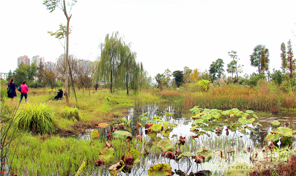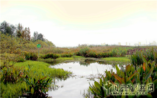 濕地生態走廊區的植物以濕生植物為主、水生植物和旱地植物為輔,設置大片的蘆葦、荷花、蒲葦、千屈菜等。當來自水面的微風拂過,使草葉發出沙沙聲響的時候,游客樂而忘俗。