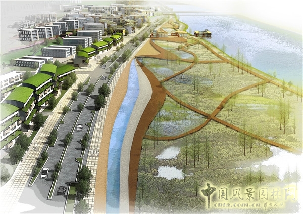 通過城市道路、城市開敞空間等將濱河景觀優勢延伸進地塊,使其提升區域的土地價值,帶動區域的發展。由濱河景觀帶延展、發展、引申而出城市景觀公園,與濱河景觀帶相互呼應、貫通和滲透發展。