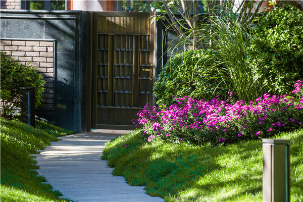 從園區整體的軟硬景比例上回顧設計,軟硬景的比例關系超過里業界里常說的8:2關系。軟景種植設計中的植物類別和部分單株植物規格也按照項目定位的要求超過苗圃常見數值。景觀設計單位希望通過這樣的設計,增強景觀對建筑環境的“軟化”和“柔化”作用,讓每一棟建筑單體的精致和細節得以完美呈現;也希望通過大比例軟景的設計增強天氣和季相變化帶來的生活體驗——住戶伴隨著早晚光影移動、庭院植物花開葉落,在建筑和景觀共同營造而成的舒適空間里感受天氣和四季的變化,讓“家”的感覺從住戶對整個空間的歸屬感中自然呈現。