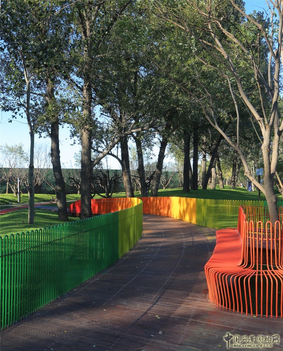 為最大限度保留良好的原生綠化,團(tuán)隊(duì)借勢(shì)以曲線路銜接,用限定視線的方式打破人工樹陣;用設(shè)計(jì)彌補(bǔ)高低起伏的地勢(shì)差,形成整個(gè)橋體波動(dòng)起伏的韻律感和動(dòng)感;欄桿的彩虹色恰好也彌補(bǔ)了北京冬日漫長(zhǎng)無(wú)色彩的遺憾。動(dòng)感又極具色彩的彩虹橋讓景觀與居者產(chǎn)生了潛移默化的化學(xué)反應(yīng)。